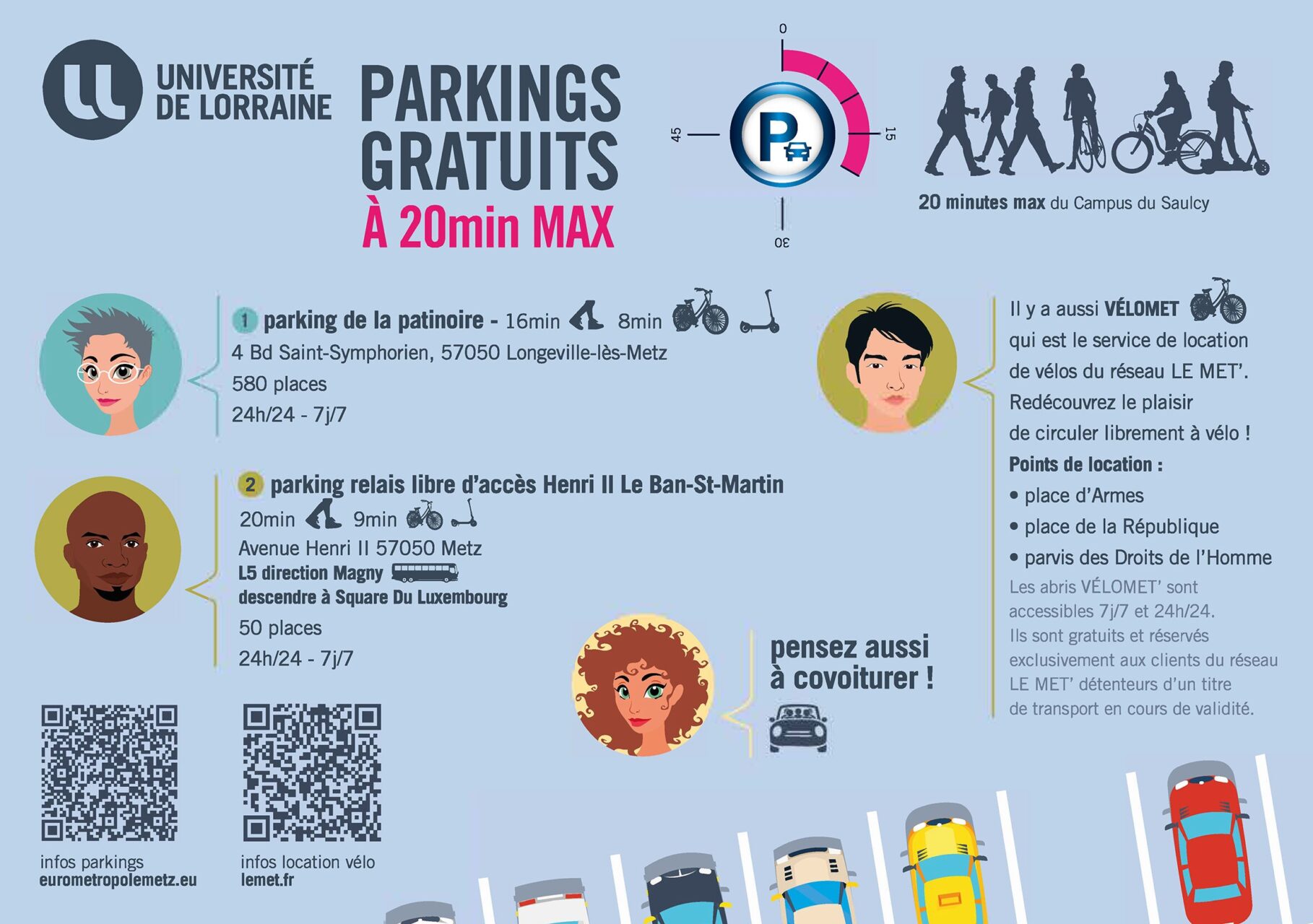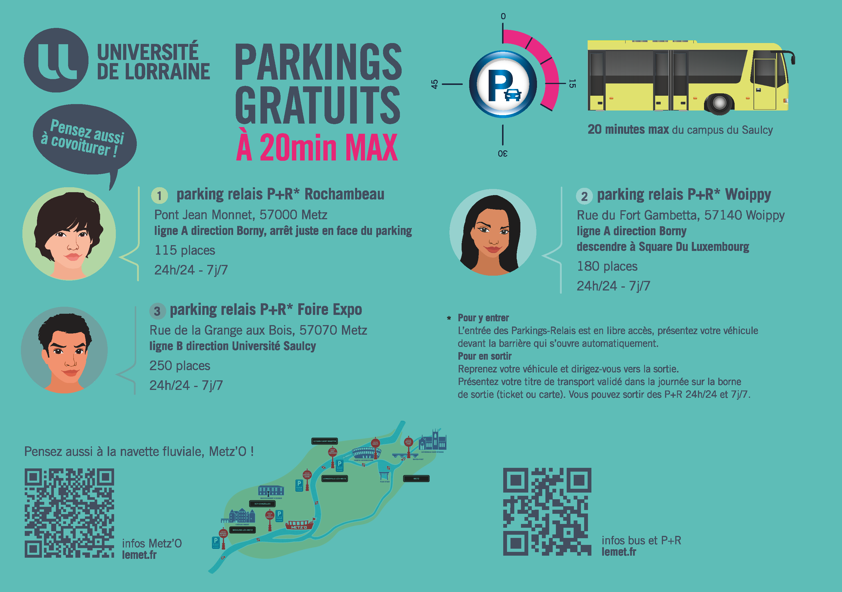 Le nombre de places de stationnement sur le Campus du Saulcy étant limité, les usagers sont invités à privilégier les parkings gratuits situés à moins de 20 minutes du Saulcy.